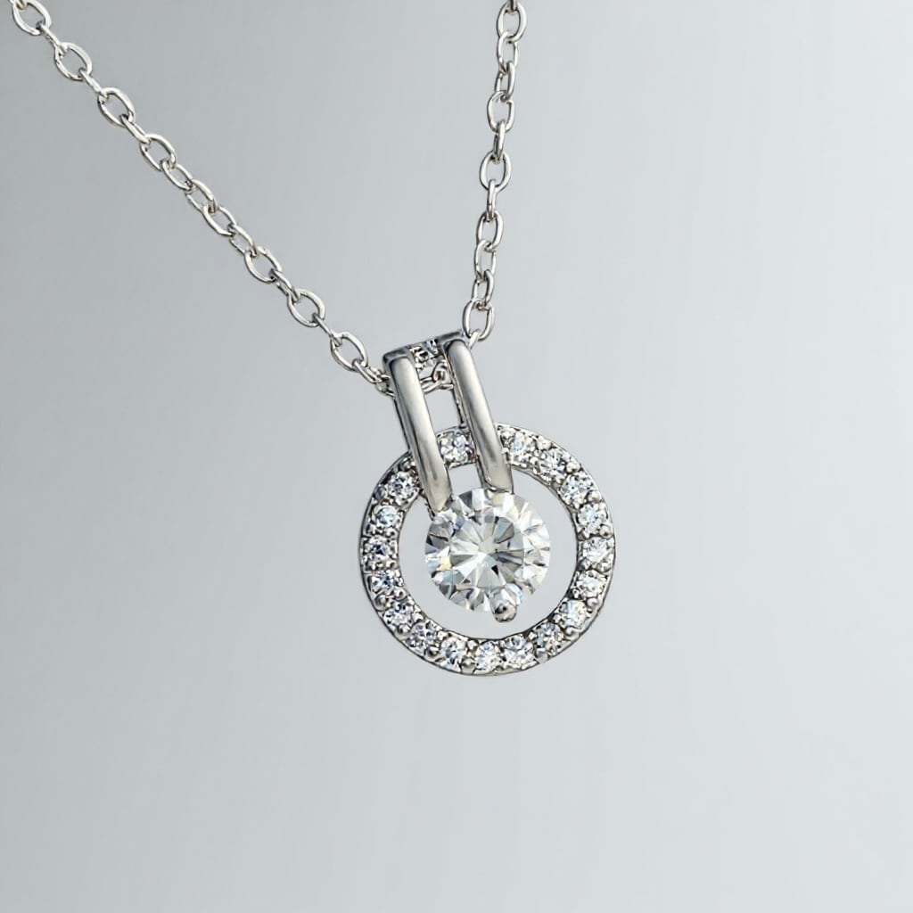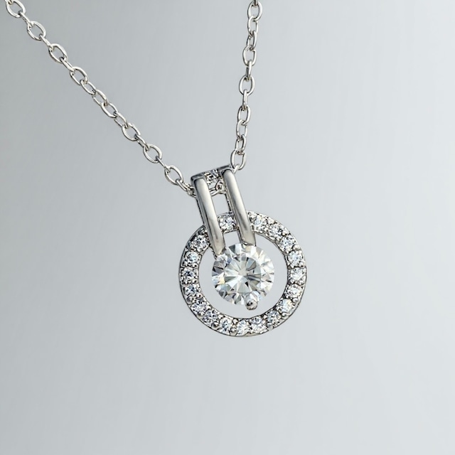 中心のCZダイヤモンドがわずかな動きにも繊細に揺れ輝く「ダンシングストーン」デザインを採用。きらめく小さなストーンで囲まれたサークルモチーフは、デコルテを華やかに、そして女性らしく演出します。