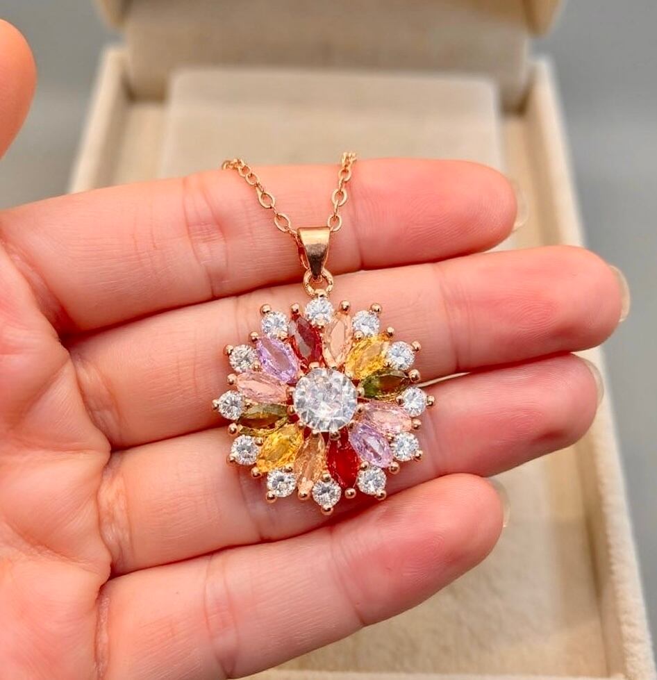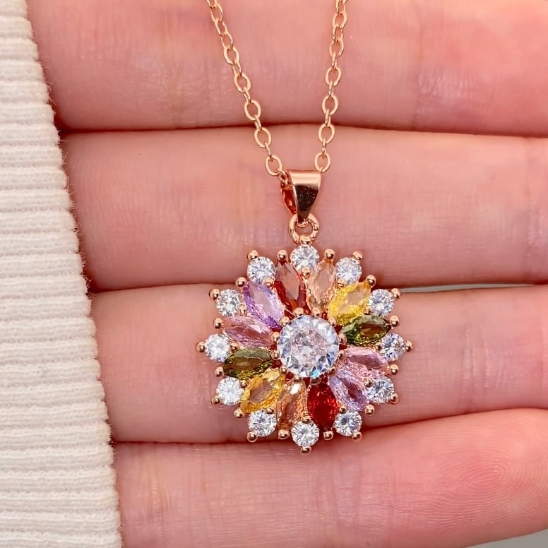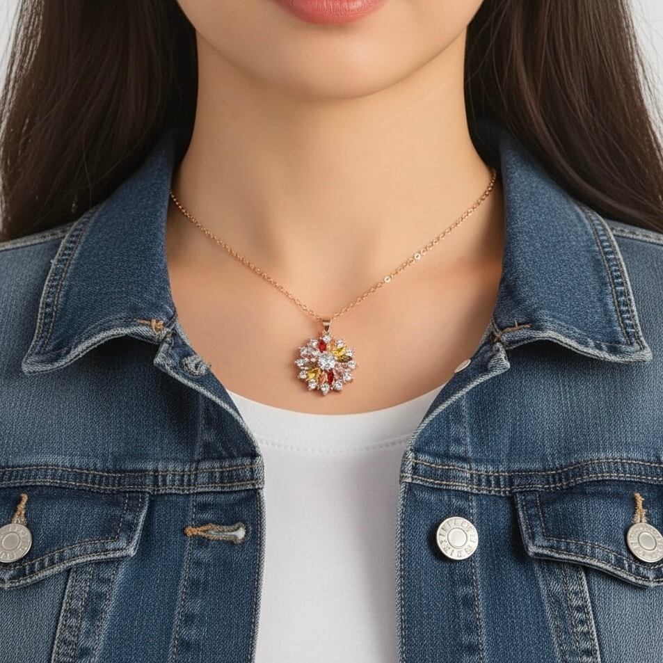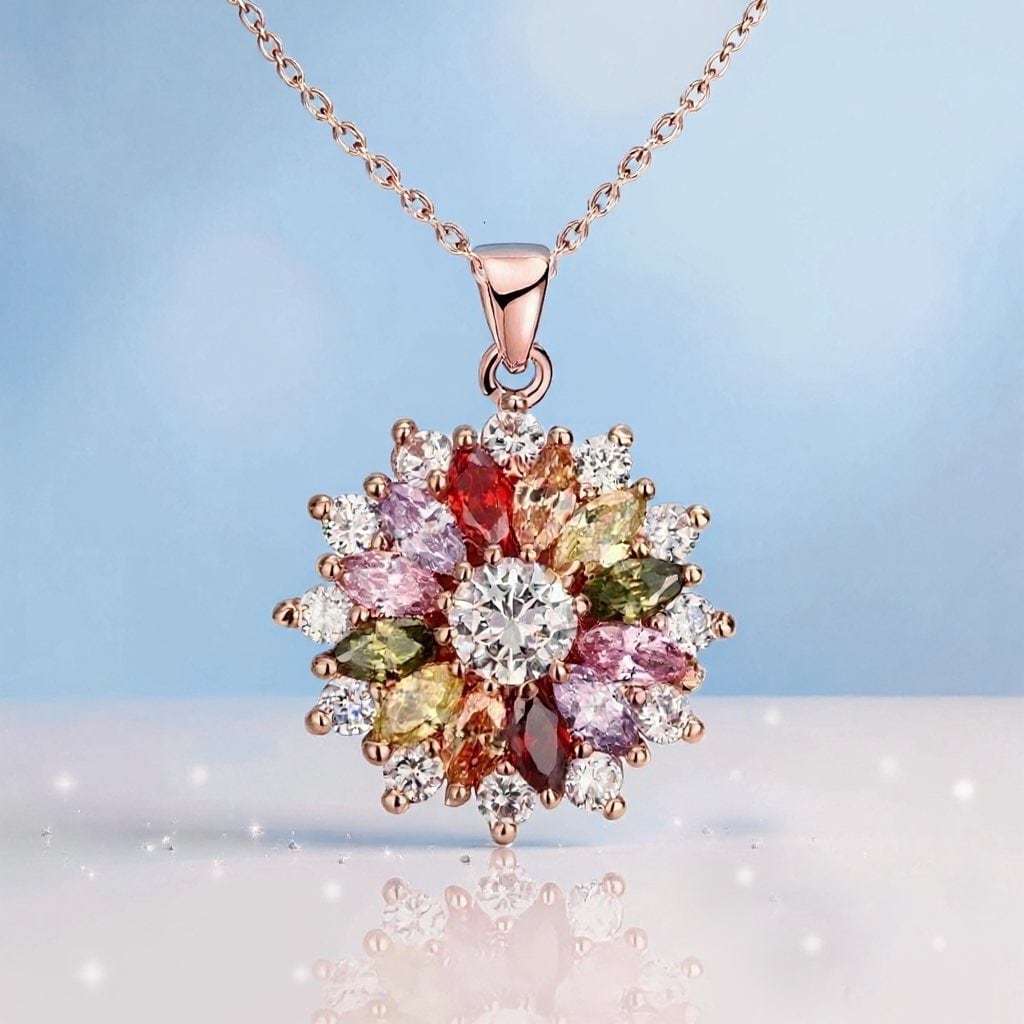 センターのクリアストーンを中心に、マーキスカットのカラフルなストーンが放射状に輝き、胸元に視線を集めます。