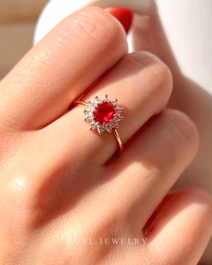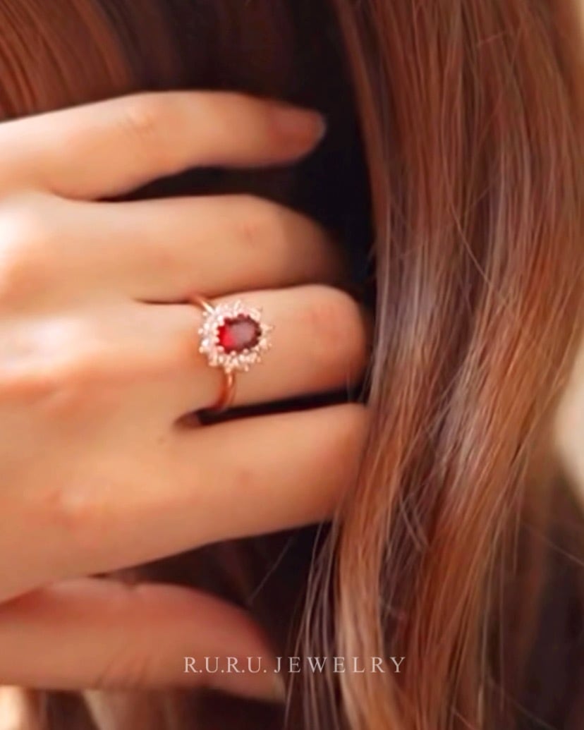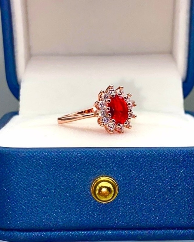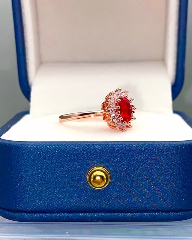 情熱的な赤い輝きを放つメインストーンと、周りのCZダイヤがきらめく。