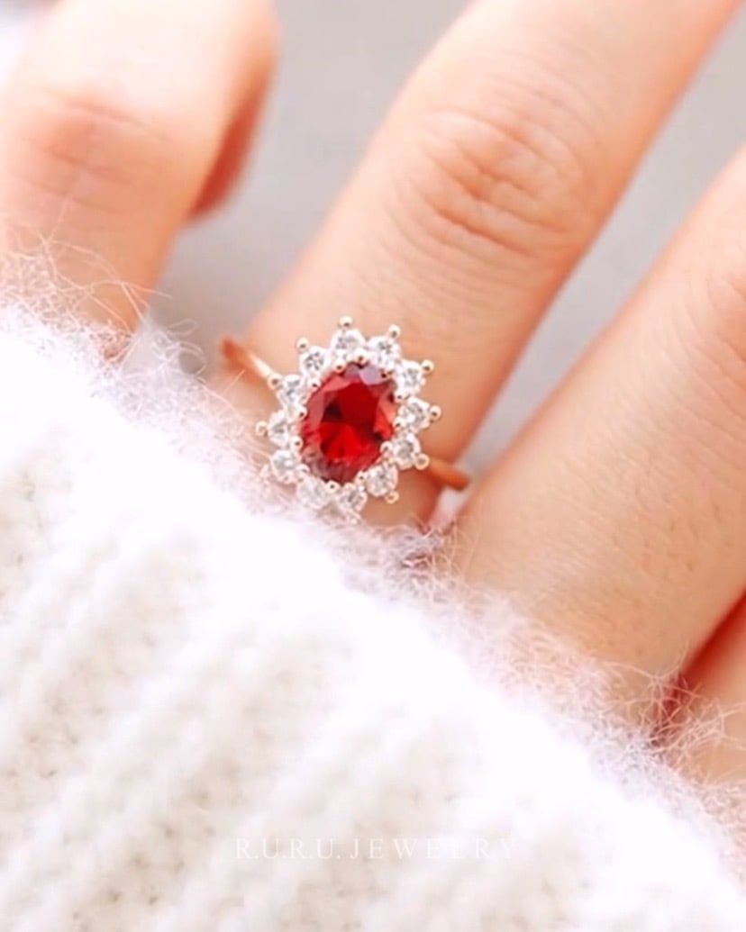 「ルビーの女王」をテーマにデザインされた、高貴な赤が主役のヘイローリング。