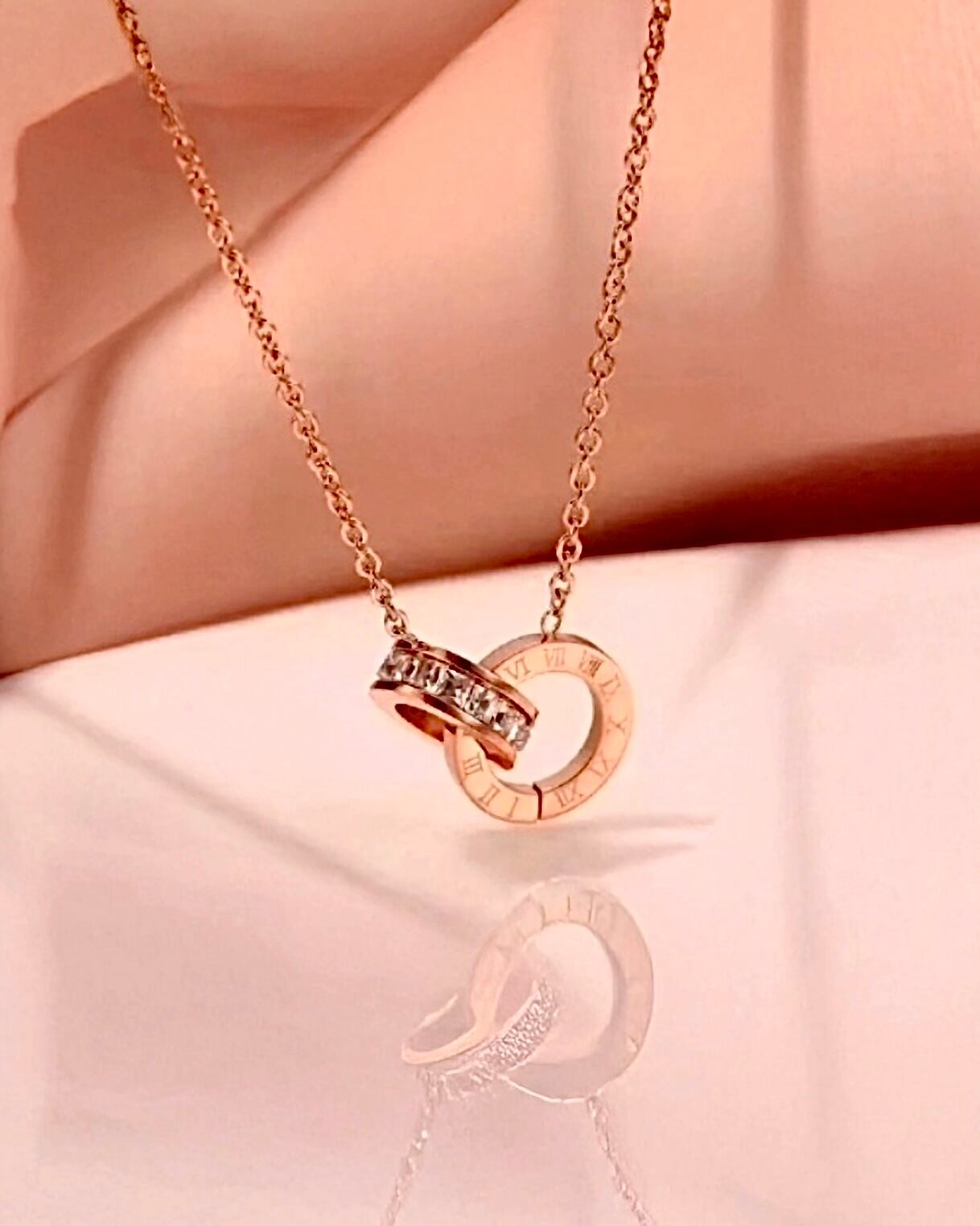 2つのリングが重なり合う、繊細でロマンティックなデザインです。一つはローマ数字が刻まれたクラシックなリング、もう一つはストーンが輝く華やかなリング。2つの異なる輝きが交差することで、唯一無二の存在感を放ちます。