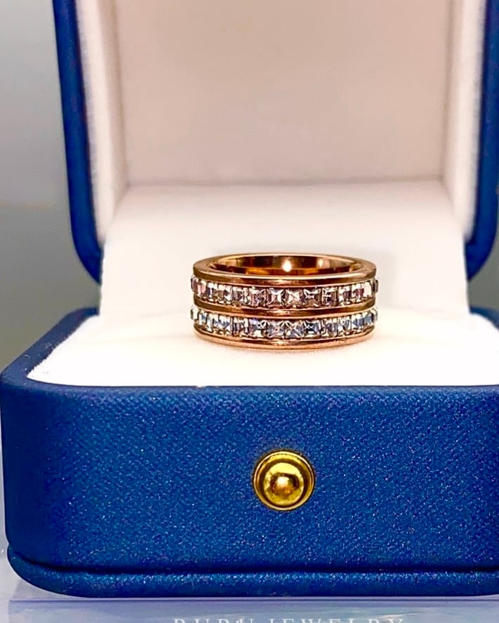 全周に敷き詰められた石が光を捉え、どの角度からも美しいキラキラ感を楽しめます。